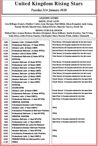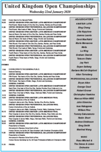 今年のUK選手権は、 2020年 1月21日、22日,23日に開催されます。 1月21日:プロスタンダード ライジング、プロラテンライジング 1月22日:プロスタンダード本戦 1月23日:プロラテン本戦 このホームページでも結果速報してゆきたいと思います。 公式サイトはこちら タイムテーブル 1日目ライジング